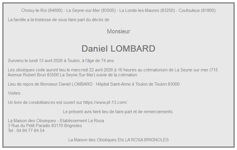 Cet espace « condoléances » est dédié à la mémoire de Monsieur Daniel LOMBARD.