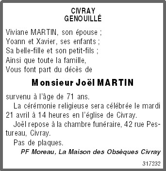 Cet espace « condoléances » est dédié à la mémoire de Monsieur Joël MARTIN.
