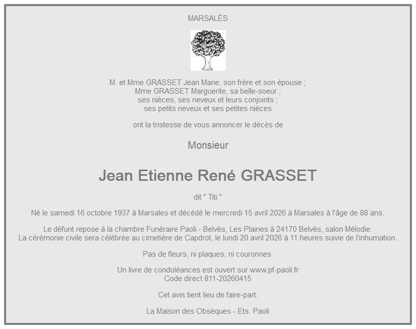 Cet espace « condoléances » est dédié à la mémoire de Monsieur Jean Etienne GRASSET.