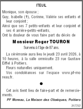 Cet espace « condoléances » est dédié à la mémoire de Monsieur Roger TOURON.