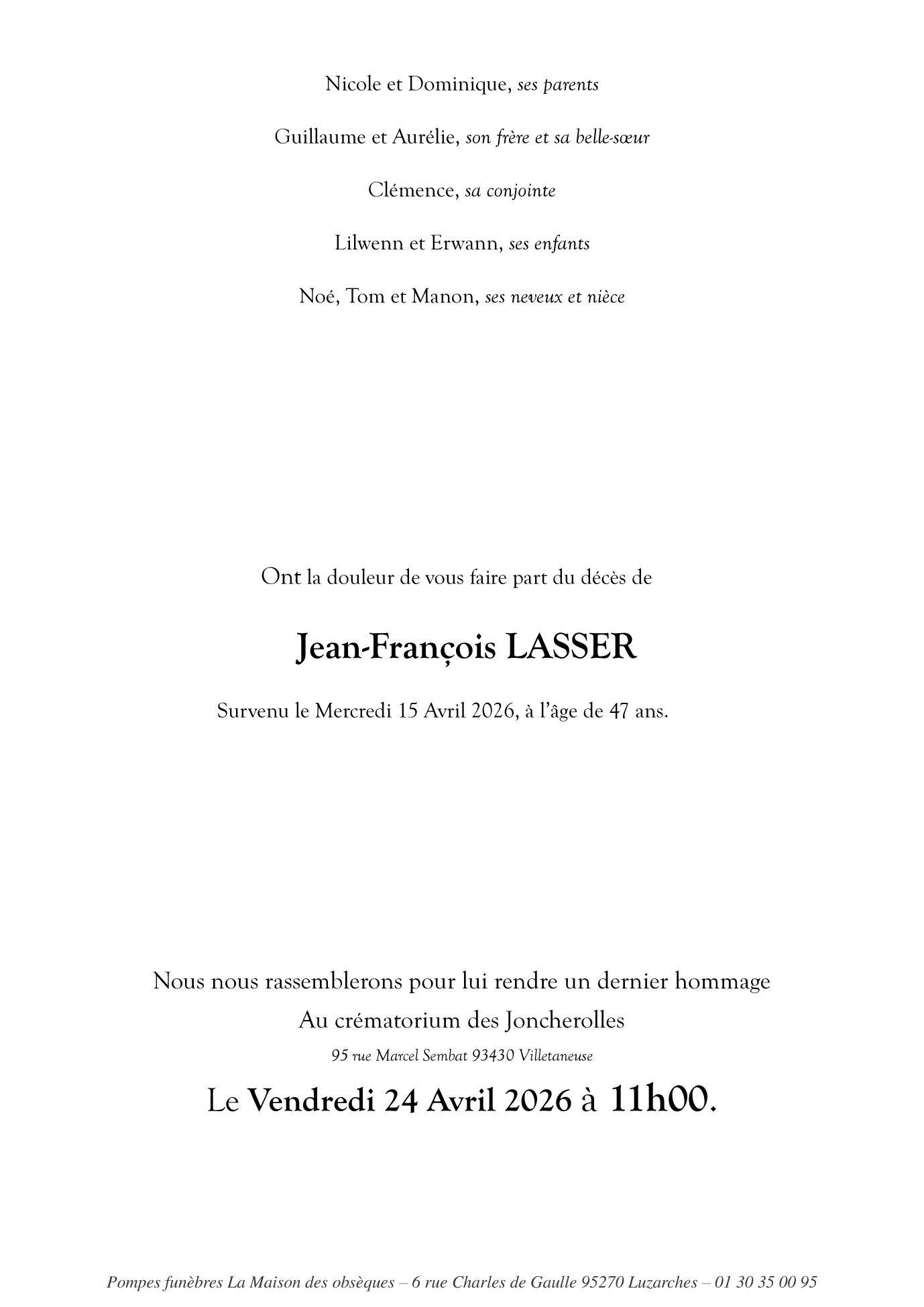 Cet espace « condoléances » est dédié à la mémoire de Monsieur Jean-François LASSER.