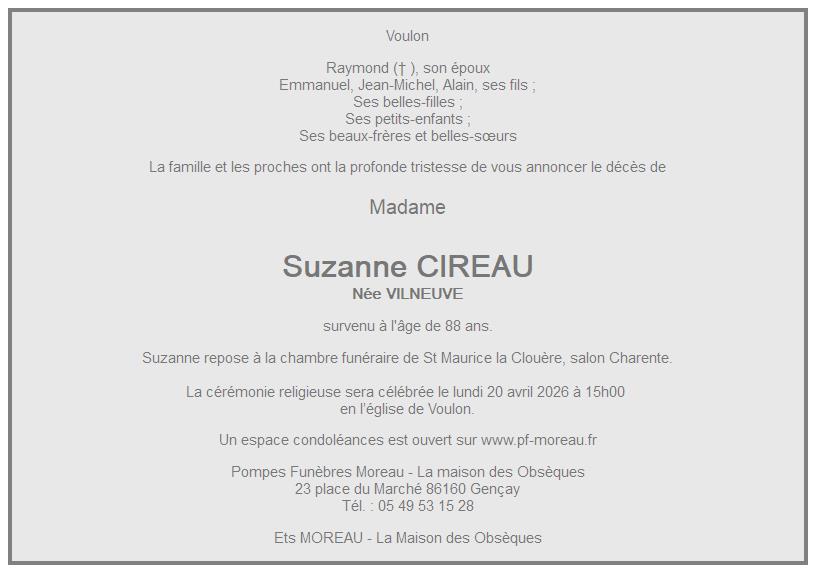 Cet espace « condoléances » est dédié à la mémoire de Madame Suzanne CIREAU née VILNEUVE.