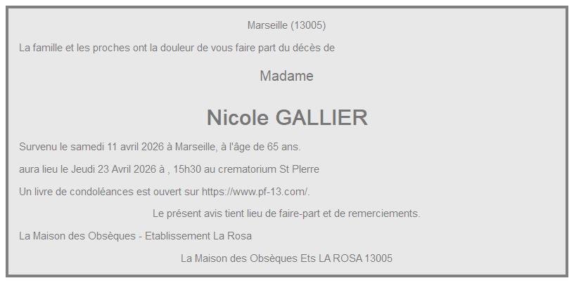 Cet espace « condoléances » est dédié à la mémoire de Madame Nicole GALLIER.