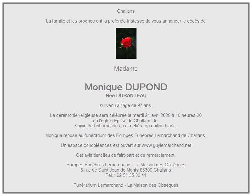 Cet espace « condoléances » est dédié à la mémoire de Madame Monique DUPOND née DURANTEAU.
