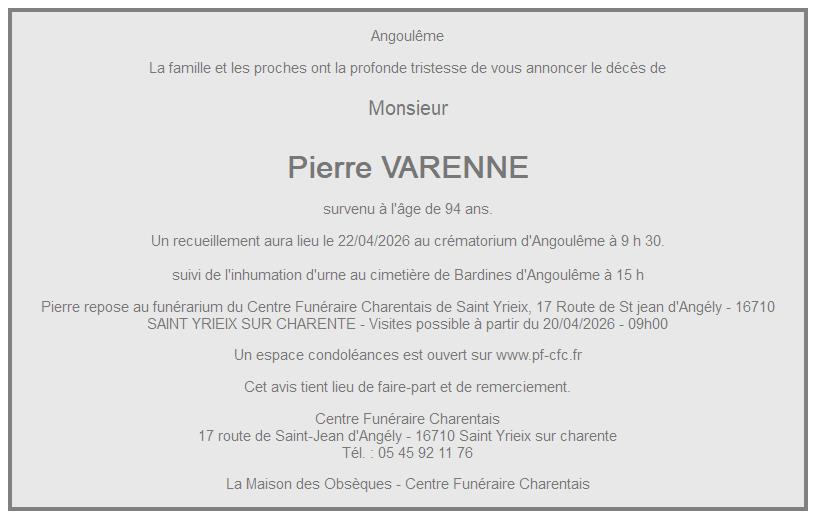 Cet espace « condoléances » est dédié à la mémoire de Monsieur Pierre VARENNE.