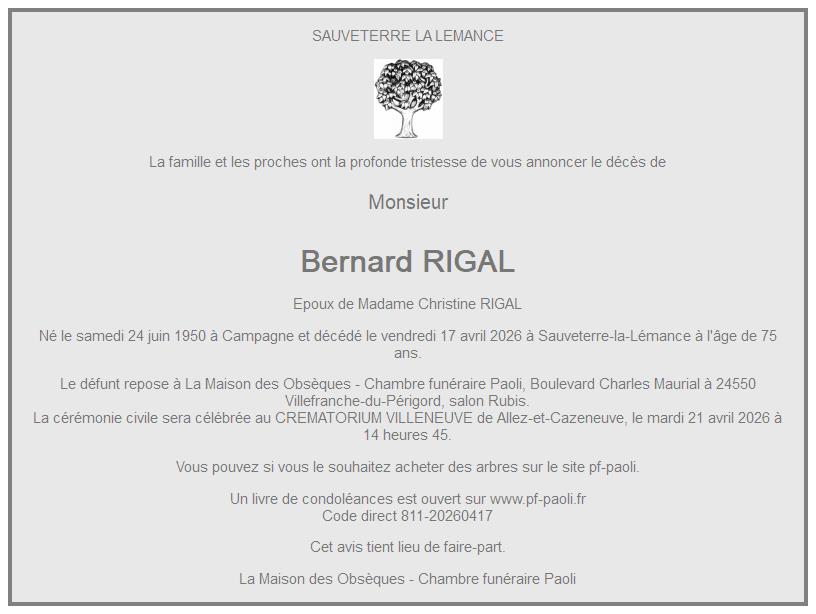 Cet espace « condoléances » est dédié à la mémoire de Monsieur Bernard RIGAL.