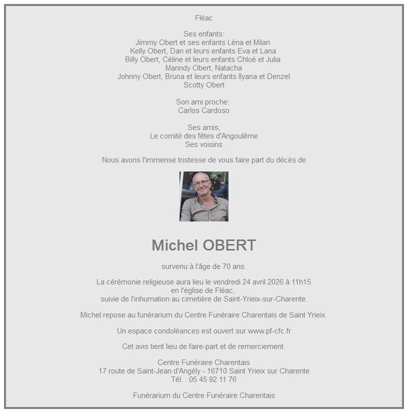 Cet espace « condoléances » est dédié à la mémoire de Monsieur Michel OBERT.