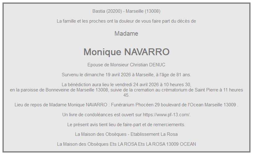 Cet espace « condoléances » est dédié à la mémoire de Madame Monique DENUC née NAVARRO.