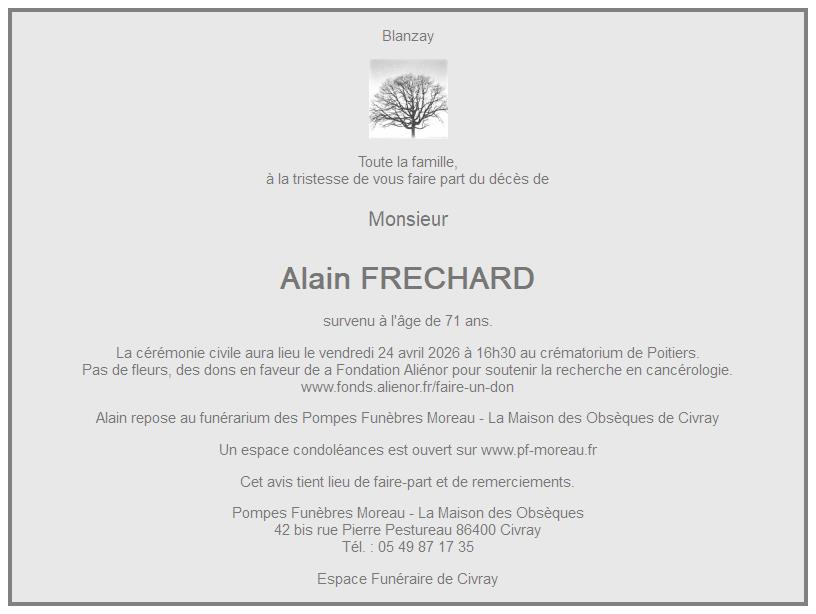 Cet espace « condoléances » est dédié à la mémoire de Monsieur Alain FRECHARD.