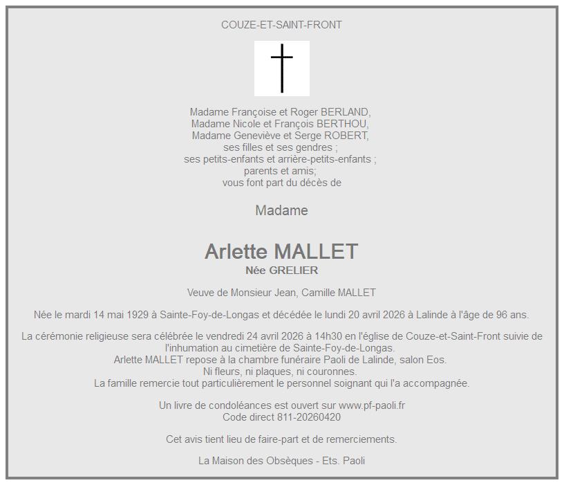 de Madame Arlette MALLET née GRELIER