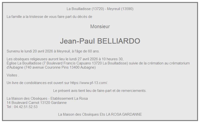 Cet espace « condoléances » est dédié à la mémoire de Monsieur Jean-Paul BELLIARDO.