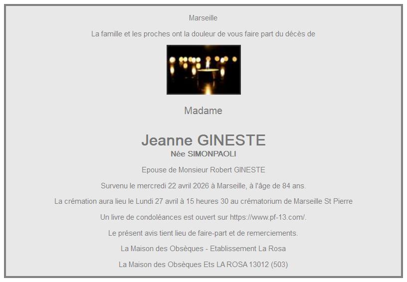 Cet espace « condoléances » est dédié à la mémoire de Madame Jeanne GINESTE née SIMONPAOLI.