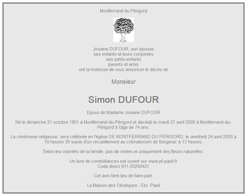 Cet espace « condoléances » est dédié à la mémoire de Monsieur Simon DUFOUR.