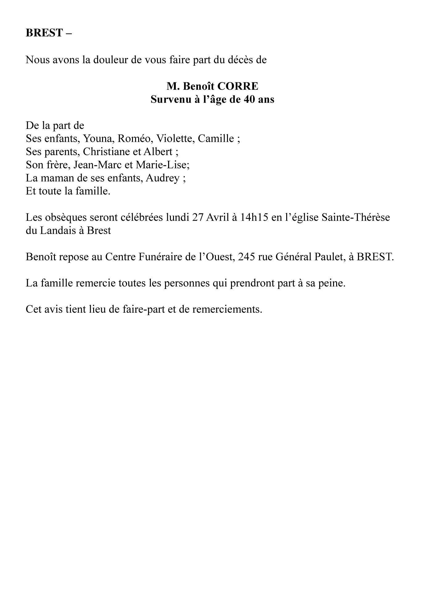 Cet espace « condoléances » est dédié à la mémoire de Monsieur Benoît CORRE.