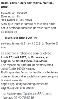 Décédé à Rezé (44400) le mardi 21 avril 2026